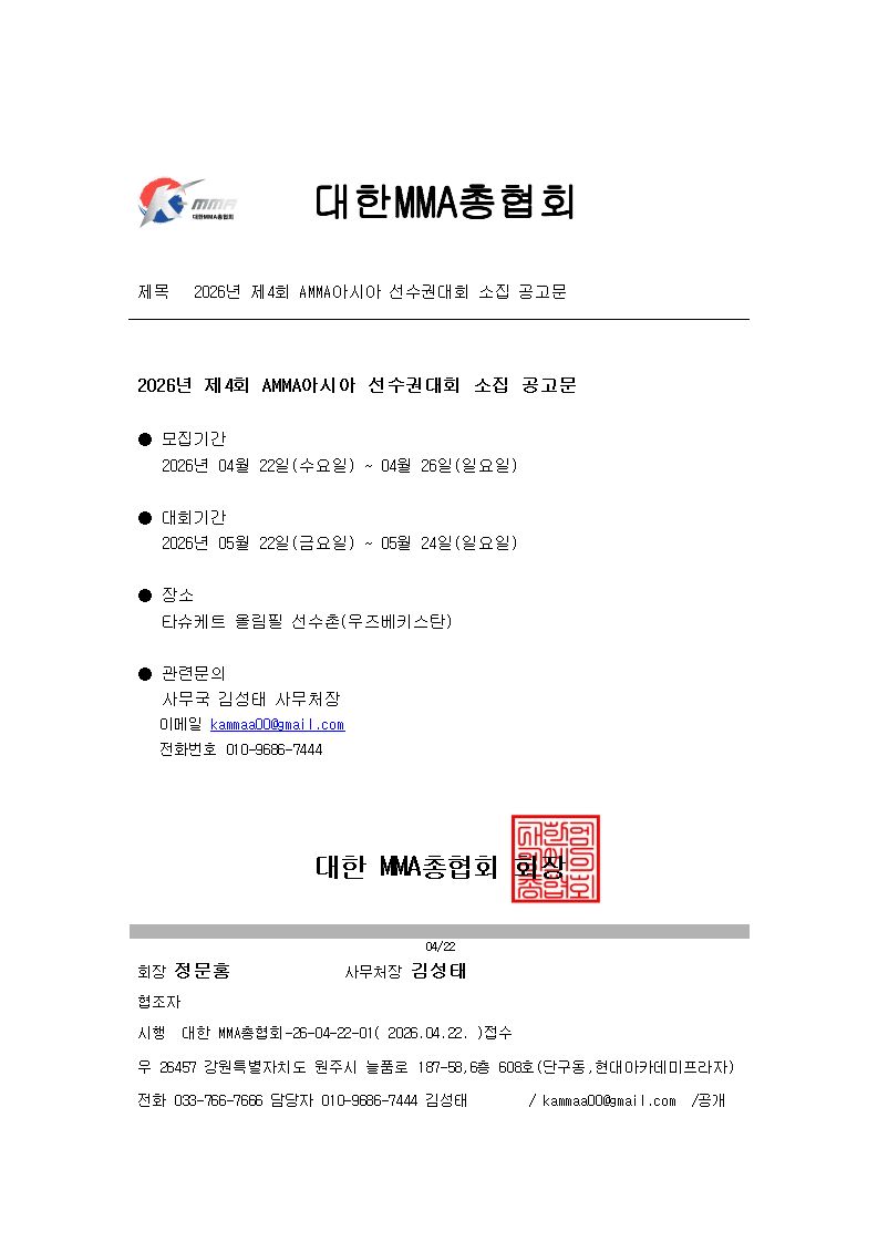 2026년 제4회 AMMA아시아 선수권대회 소집 공고문 (2026.04.24.)